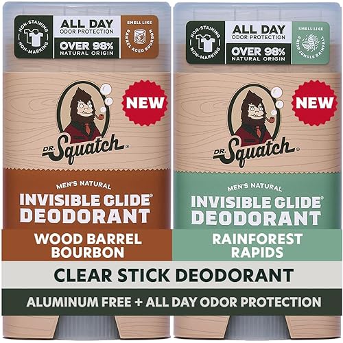 Dr. Squatch Invisible Glide Natural Men’s Deodorant – Smooth Glide, No Stains – Aluminum Free Deodorant Men – Safe for Sensitive Skin – Wood Barrel Bourbon + Rainforest Rapids, 2.65oz (2-Pack)