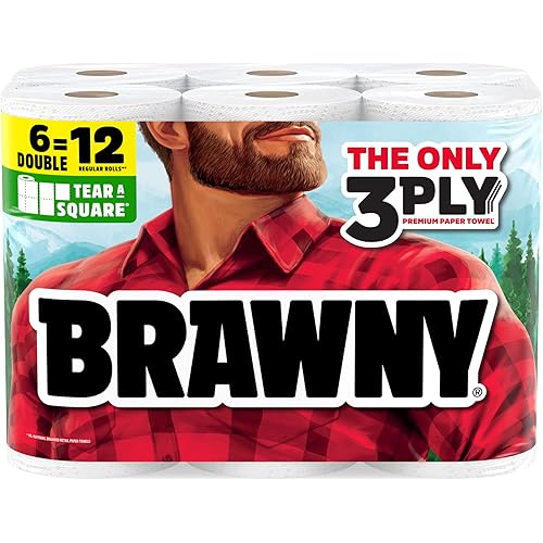 Brawny Tear-A-Square 3-Ply Paper Towels, 6 Double Rolls = 12 Regular Rolls, Strong, Absorbent, and Durable with 3 Sheet Sizes (Quarter, Half, Full)